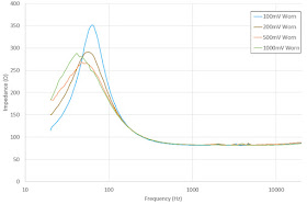 上のグラフはテスト信号を100mVから200、500、1000mVと変化させた結果です。1000mV(1V)ともなると、うるさすぎて測定するのも厳しいような状態ですが、これくらいの爆音で聴いている人も結構見かけます。信号が大きくなるにつれ共振点のインピーンダンスと周波数が若干低くなっていき、さらに3kHz付近のアクセントも若干変化しているようです。